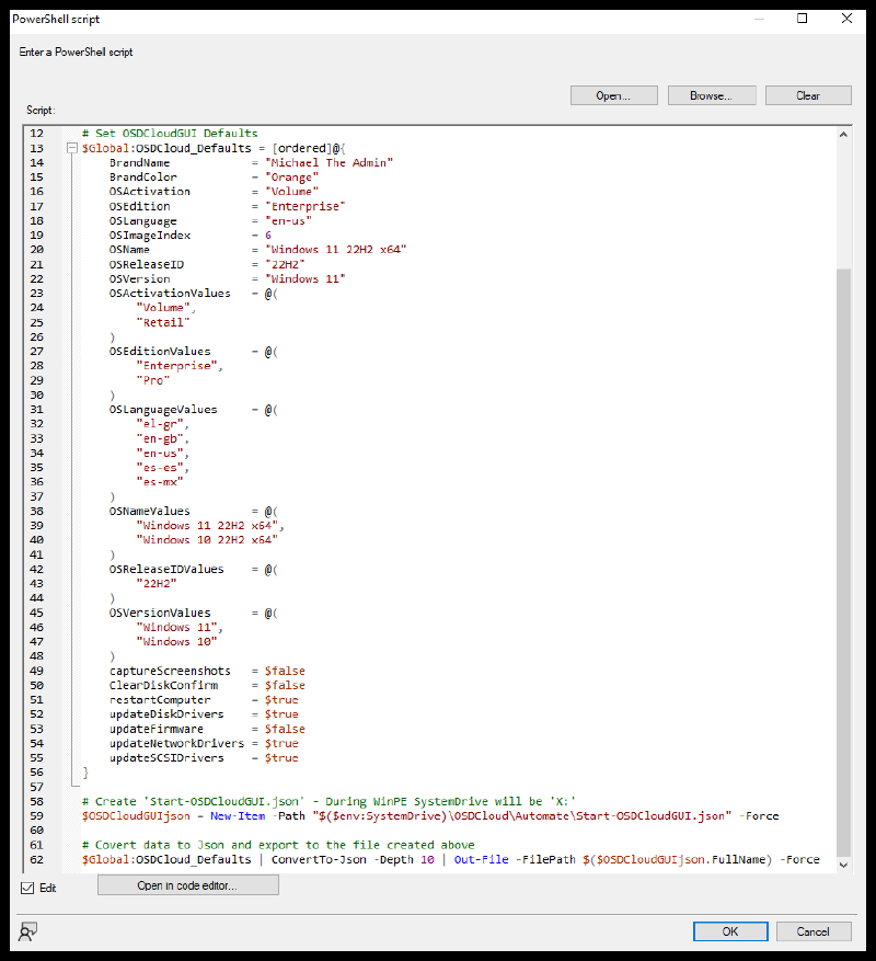 $Global:OSDCloud_Defaults | ConvertTo-Json -Depth 10 | Out-File -FilePath $($OSDCloudGUIjson.FullName) -ForceCreate-OSDCloudGUI-Defaults.ps1 ยท MichaelEscamilla/MichaelTheAdmin (github.com)